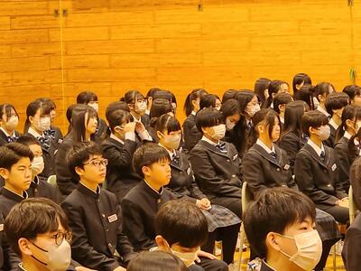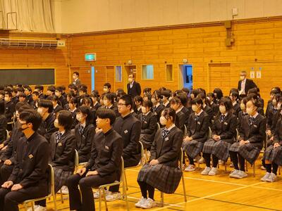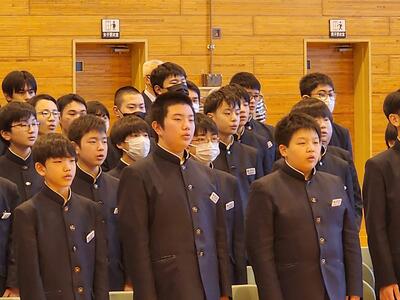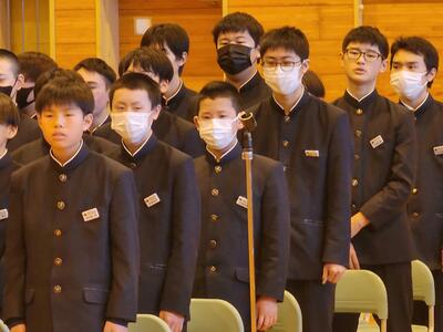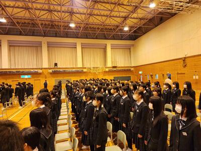3月5日(水)、1・2年生が体育館で卒業証書授与式に歌う式歌の練習を行いました。この日は、卒業を迎える3年生のために、在校生が心を込めて歌う式歌の練習が行われました。卒業証書授与式で歌う式歌は、3年生にとっても大切な思い出となります。1・2年生にとっても、この式歌を通じて、今までお世話になった3年生への感謝の気持ちを伝える大切な機会です。