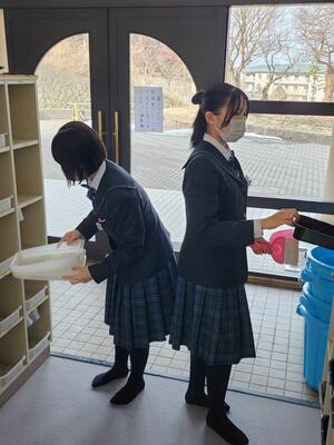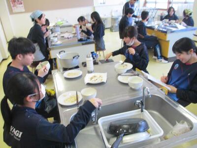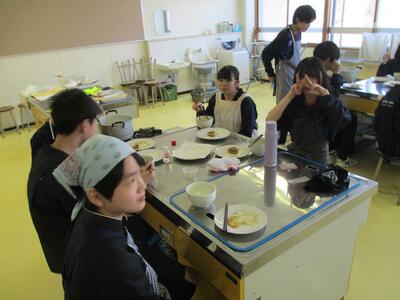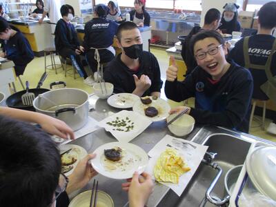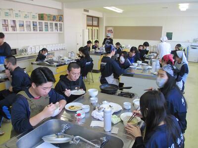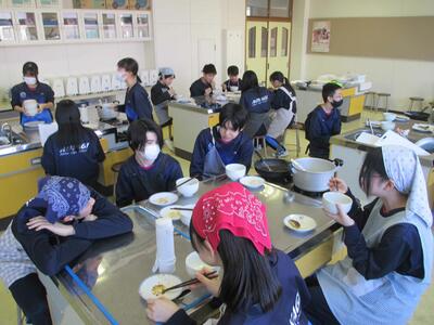 調理が終わると、生徒たちは作った料理を実際に食べて、その味を楽しんでいる様子が見られました。三平汁の温かさといももちのもちもち感が、どちらも大変好評で、クラスメイト同士で感想を交換しながら楽しいひとときを過ごしました。実際に自分たちの手で作った料理を味わうことで、料理の楽しさや達成感を感じることができた実習となりました。