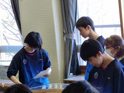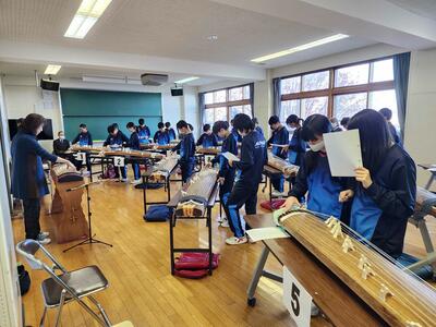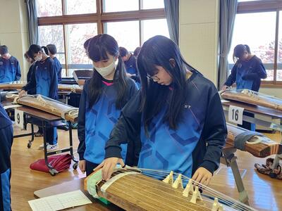 始めに講師の先生から、演奏時の手の使い方や形、音を上手に出す弦の弾き方について教えていただきました。その後、1つの箏を2人1組で「さくらさくら」の演奏を練習し、生徒同士で教え合いながら取り組んでいる様子が見られました。