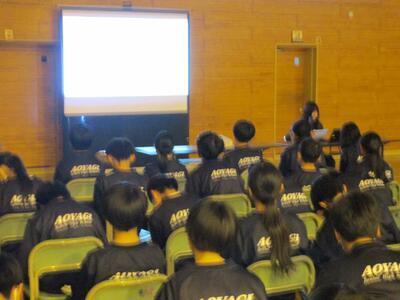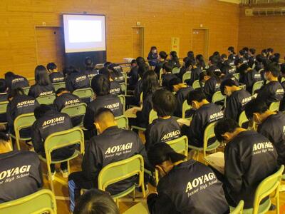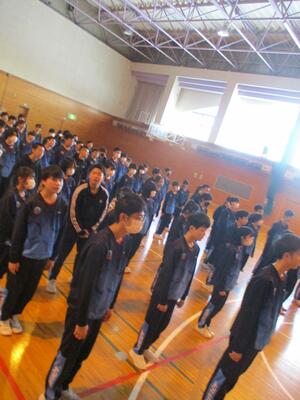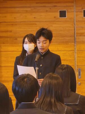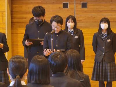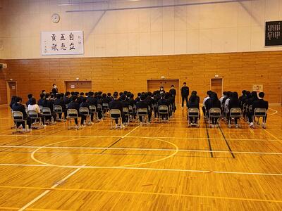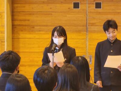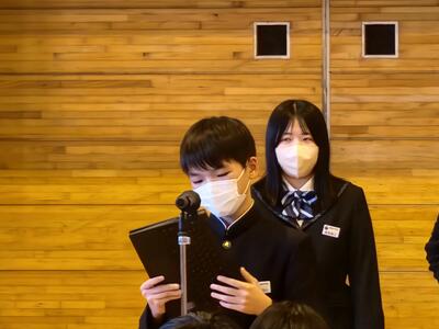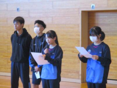 12月11日(水)5時間目、2年生が体育館で学年集会を行いました。はじめに、学級委員および各学級の代表から2学期を振り返っての発表があり、よくなってきた部分と課題についての内容でした。その後、各委員の代表からも同様の発表がありました。じっくり聴いていると、自分たちの学年や学級をきちんと見つめていることがわかりました。これならば、今後、ますますよい学年になりそうな予感がしました。