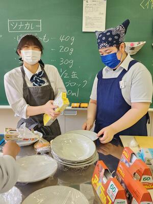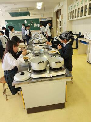 今週、2年生では家庭科の授業で調理実習が行われ、今日、最後に2年C組がツナカレーライスを作りました。他の学級同様に、楽しみながらも協力して調理する様子が見られました。