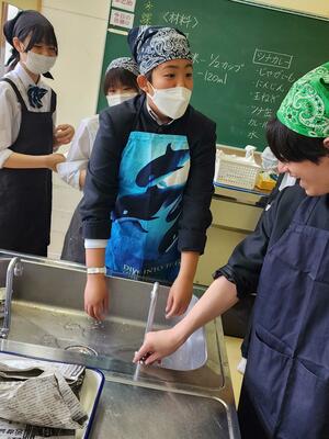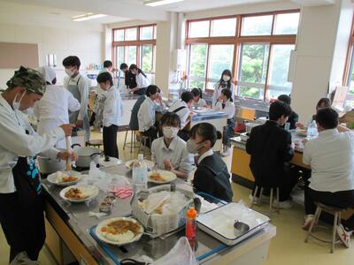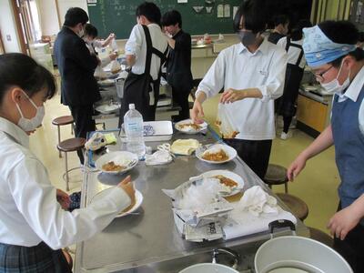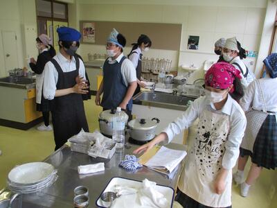 6月10日(水)、家庭科の授業で2年A組が調理実習を行いました。各グループでツナカレーライスを調理しました。材料をビニール袋に入れ、熱湯に浸す方法を行いました。協力しながら、準備を進め、美味しくいただくことができました。