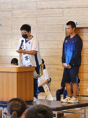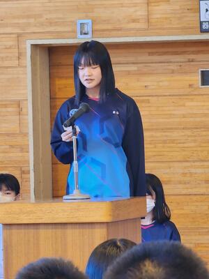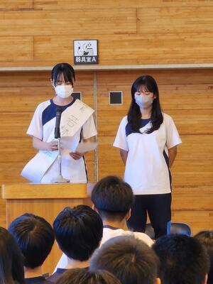 1年間副会長を務め、今年度生徒会長に立候補した塚本 旬さん(2年)は、「昨年度の経験を生かし、いじめがなく、明るく楽しい学校にしていきたい。そのためには、まずは改めて、気持ちのよいあいさつを見直し、継続させていきたい」と全校生徒へ決意を述べていました。