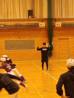1月19日(日)、田中隆貴さん(せたな北檜山中-知内高-高知ファイティングドックス)が野球部の練習の指導に来てくれました。ウォーミングアップから個別・全体練習まで、中学生にわかりやすく教えてくれました。