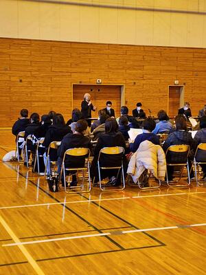 2月14日(金)北方領土への関心を高め理解を深めるために、北方領土を題材にした「ジョバンニの島」を鑑賞し、北方領土島民二世の方の講話を聞く「ふるさと学習会」が2年生を対象に行われました。