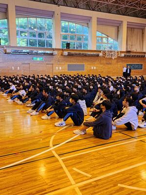 生徒たちは、真剣な態度で素早く避難し、約280名の全校生徒の人員確認まで3分を切って終えることができました。特に2・3年生の行動は素晴らしく、さすがと思えるものでした。最後には、それぞれが教室で訓練について振り返りました。今後も、自他の生命の安全を守る心構えをもたせていきたいと思います。