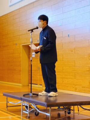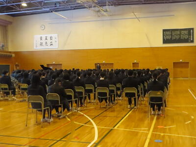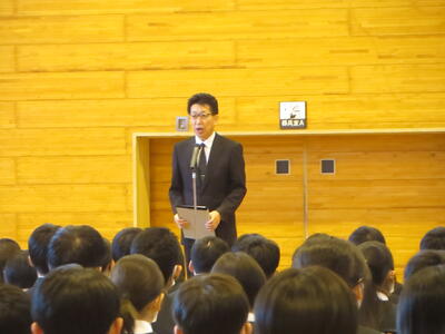12月25日(月)2学期の終業式が行われました。始業式では、生徒会書記局の工藤彩来さん・後藤優月さんの2名が司会を担当して進行しました。また、各学年を代表し、1年生は小澤奈央さん、2年生は浅利康太朗さん、3年生は永井顕文さんの3年がスピーチしました。