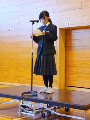 3年生の永井さんは、「2学期頑張ったことは文化祭」と挙げ、「文化祭の合唱交流会では、自分がやってみたかった指揮者をやり、伴奏者、パートリーダーのおかげで合唱を通して学級の団結力が向上した。」と、行事を通して充実感がもてたことについて話しました。また、「3学期は、今まで以上に大変な学期になると思う。受験に向け、充実した時間を過ごせるようにしたい。」と、目前に迫った受験への意気込みを語っていました。
