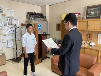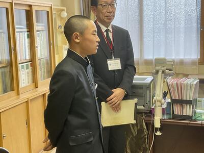 先日、校長室にて新人戦の表彰が行われました。五稜郭中学校と合同で参加し、結果は準優勝でした。来年に向けて、多くの課題と成果を出すことができた大会になりました。応援ありがとうございました。