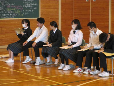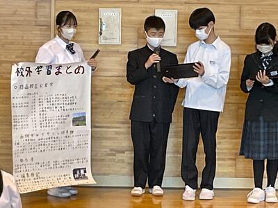 1年生の『総合的な学習』の授業の一環で行った校外学習の発表会が、11月2日(木)3・4時間目に体育館で行われました。各班、工夫を凝らして、学習してきたことをまとめ、発表していました。自分たちの住んでいる地域について知るよい機会になり、多くのことを学ぶ場になりました。