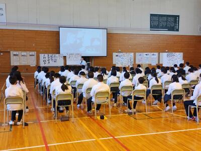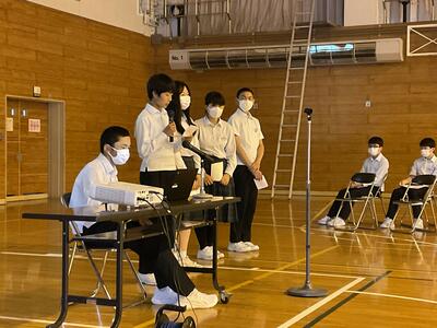 全校生徒が一堂に介して体育館で行われ、各学年の代表が1学期を振り返り、思いを述べました。