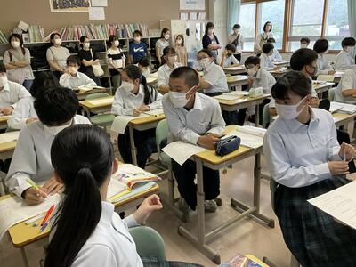 7月12日(水)、今年2度目の授業参観と学年懇談会が開催され、保護者119名、近隣小学校の教職員44名、学校運営協議会委員2名が訪れ、生徒の様子を参観いただきました。全教室で授業公開をし、生徒はいつも以上に、張り切って学習に取り組んでいたようです。参観後は各学年の懇談会が行われ、1学期の生徒の様子・宿泊研修・進路についての交流がありました。