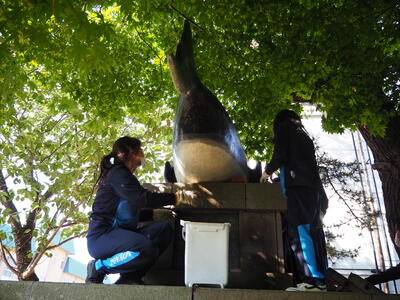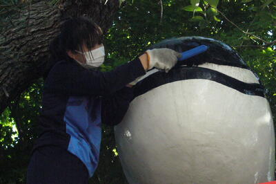 生徒会のメンバーは供養塔周囲の草むしりをしたり、鯨像をたわしで磨いたりと、地域の文化に触れながら汗を流していました。