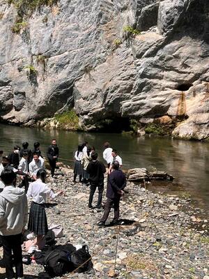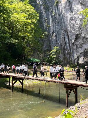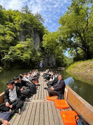 日本百景のひとつである猊鼻渓では、天候にも恵まれ、学級ごとに舟下りを楽しみました。川の流れに揺られながら、大自然の雄大な景色を満喫し、心に残る貴重な体験となりました。また、運玉を投げ、岩の穴に入れば願いが叶うとされる運試しに挑戦する生徒の姿も見られ、楽しみながら思い出を深めることができました。