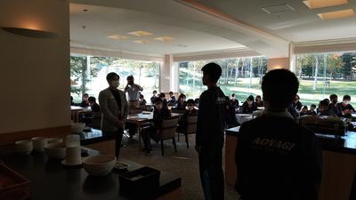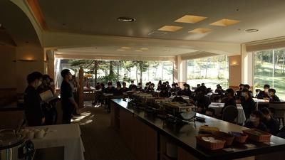 おはようございます。全員元気に朝食を迎えています。写真は、昨日の室長会議の様子と、ホテルから見える朝日、朝のルスツの山々、朝食と朝の集い、退館式の様子です。