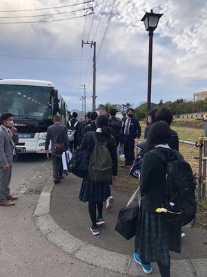 気温は15度前後と若干涼しいですが、天気もよく、体調不良を訴えている生徒もいないとのことです。現在、次の目的地、苫小牧へ向かっています。
