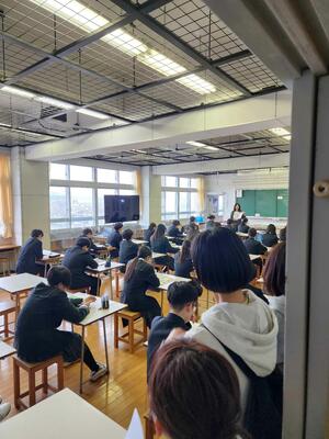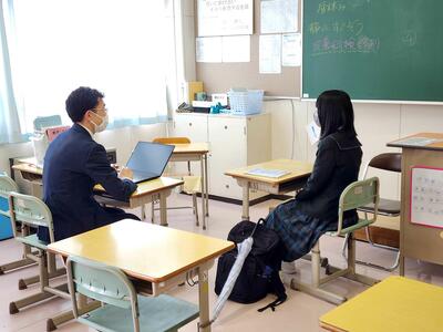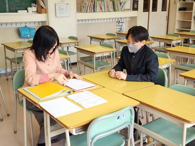 教育相談では、担任の先生が生徒の声にじっくり耳を傾け、日ごろの悩みやこれからの目標について話し合います。生徒にとっては、自分の気持ちや考えを伝える貴重な機会となっています。