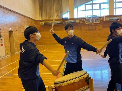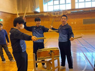 松岡先生からは、和太鼓の基本的な構え方や力の入れ方、そしてかけ声などを教えていただきました。生徒たちは、先生の指導のもと、和太鼓に向かう姿勢や演奏のコツをしっかりと学びました。演奏の最後には、決めポーズを取るなど、楽しみながら演奏を進めていきました。