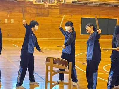 11月19日(水)、2年生の音楽の授業で、和楽器である和太鼓の学習が行われました。この日は、函館市のアウトリーチ事業の一環として、和太鼓の専門家である「こぶし座」の松岡智恵美先生をお招きし、指導を受けました。