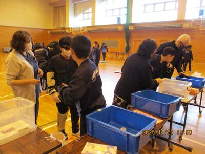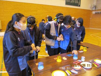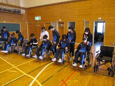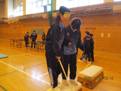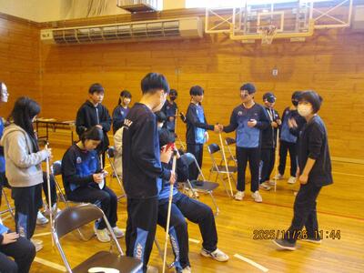 体験内容は、高齢者疑似体験、車いす介助体験、視覚障がい者歩行体験の3つの項目から2つを選び、それぞれ体験しました。生徒たちは、普段の生活では感じることのできない障がい者の立場に立って、実際に体験し、支援することの重要性を実感しました。