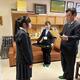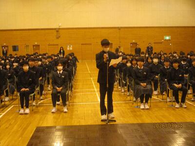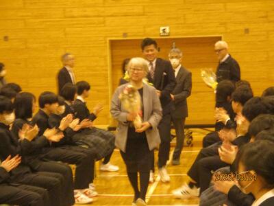 式では、2年B組の畑瀨結晟さん(生徒会書記局)が代表として、これまでの感謝の気持ちを込めて心温まる挨拶を述べました。その後、生徒会書記局のメンバーから、離任される職員一人ひとりに花束が手渡され、感謝の意が伝えられました。