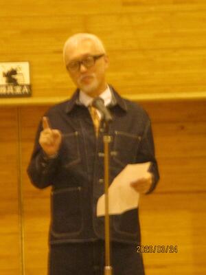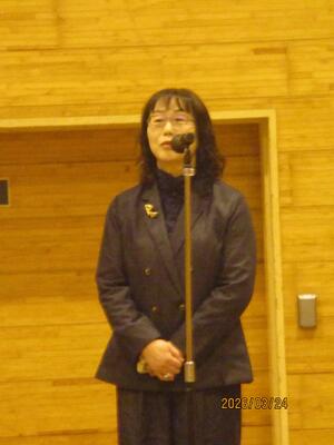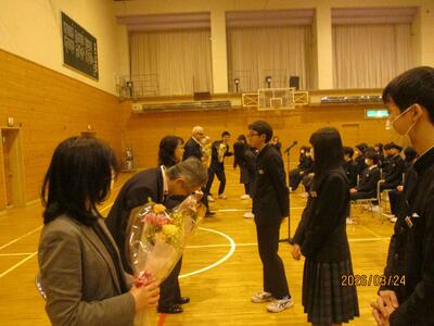今年度の修了式後、青柳中学校では離任式が行われ、本校を離れる8名の職員を送り出しました。
