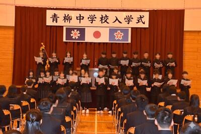 入学式では、新入生代表生徒が壇上に立ち、これからの中学校生活に向けて頑張りたいことや現在の胸の内を力強く、立派に述べました。続いて、3年生有志による校歌披露があり、新入生の前で先輩らしい姿を見せ、温かな雰囲気の中で式典が進行しました。